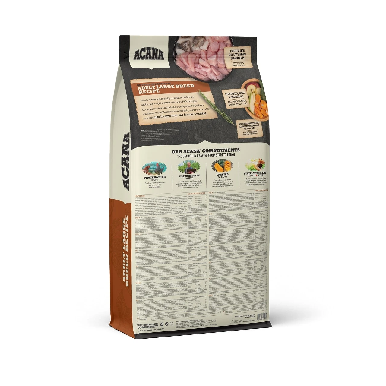 Met hoogwaardige dierlijke ingrediënten uitgebalanceerd met dagelijks geleverd fruit, groenten en plantaardige ingrediënten, is elke maaltijd van ACANA Adult Large Breed Recept alsof deze van de boerenmarkt komt. 1e ingrediënt is verse Canadese kip. Onze verse ingrediënten gebruiken koeling als enige conserveringsmethode en onze rauwe ingrediënten worden ingevroren op hun maximale versheid.