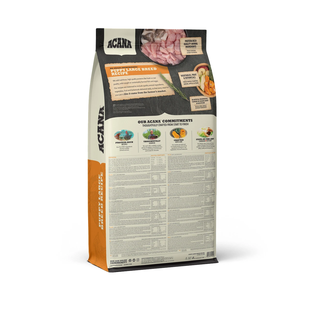 Met hoogwaardige dierlijke ingrediënten uitgebalanceerd met fruit, groenten en plantaardige ingrediënten die dagelijks worden geleverd, is elke maaltijd van ACANA Puppy Large Breed Recept alsof deze van de boerenmarkt komt. 1e ingrediënt is verse Canadese kip. Onze verse ingrediënten gebruiken koeling als enige conserveringsmethode en onze rauwe ingrediënten worden ingevroren op hun maximale versheid.