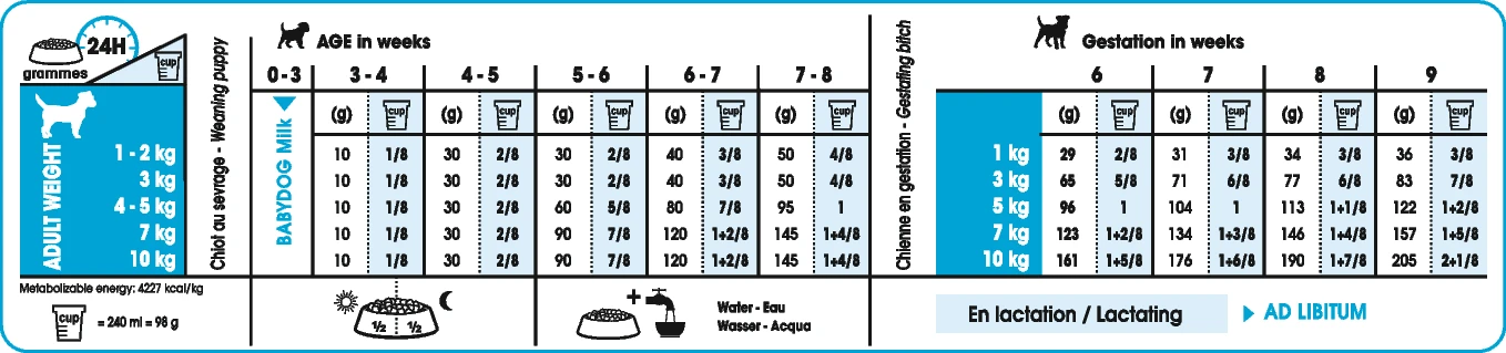ROYAL CANIN® Mini Starter Mother & Babydog is geschikt voor volwassen honden met een maximaal lichaamsgewicht van 10 kilogram. Voor de moederhond en voor puppy’s tijdens de speenperiode tot een leeftijd van 2 maanden.